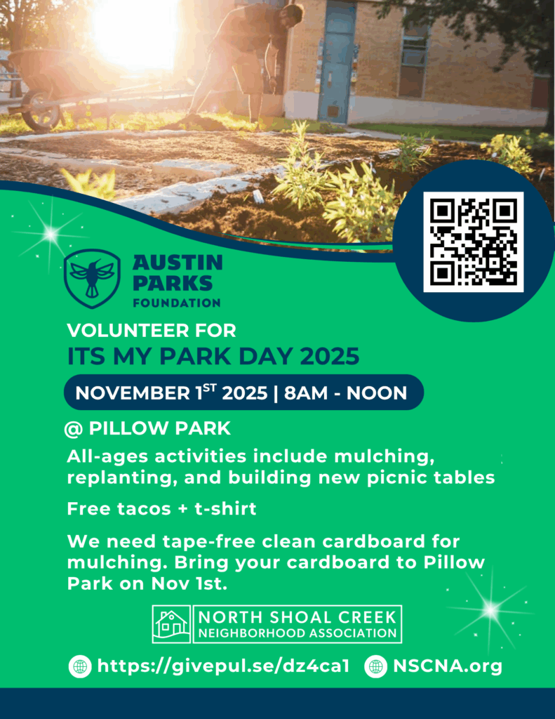 In 2020-2021 , through a collaboration between Westcave Preserve, AISD, and local ecologists, a series of new eco-educational landscape amenities were built around Pillow Park, including new paths, stone block seating circles, and a “sensory garden” path. Today, AISD is working with NSCNA to restore and maintain these gardens for the Pillow and North Shoal Creek communities. Come join us!